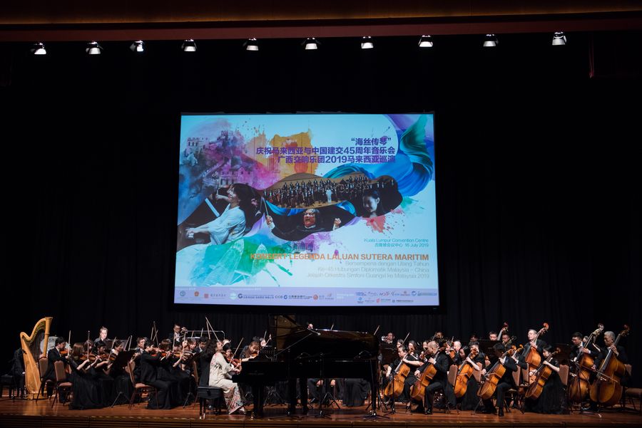 Malaysian pianist Claudia Yang (front) and the Guangxi Symphony Orchestra perform during the "Maritime Silk Road Legend Concert 2019" in Kuala Lumpur, Malaysia, July 16, 2019. Musicians from China and Malaysia jointly put on a classical music performance here on Tuesday, playing out melody featuring cultural uniqueness to mark the 45 years of diplomatic relations between the two countries. (Xinhua/Zhu Wei)