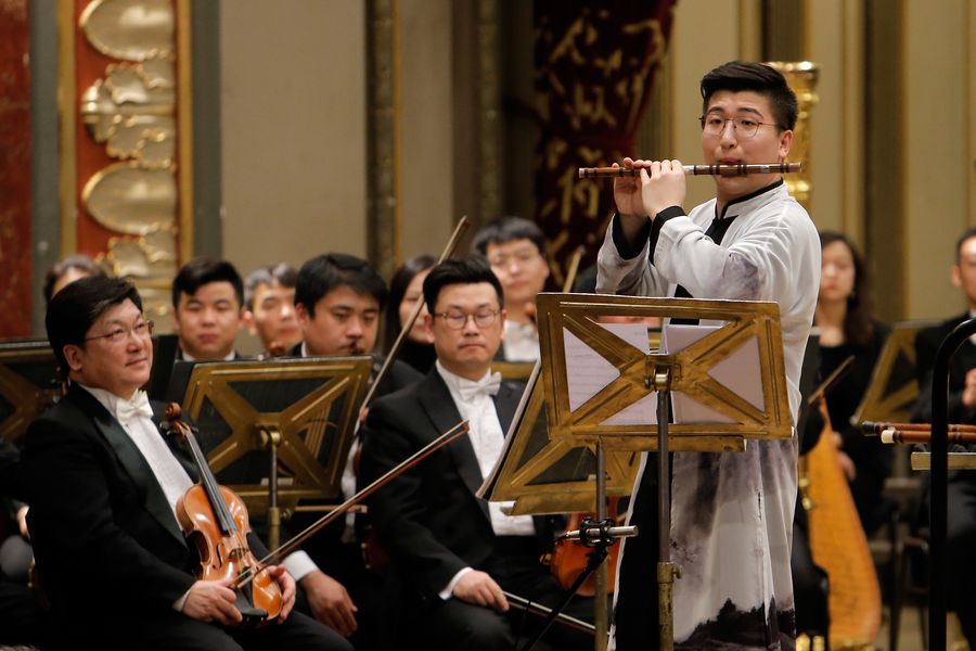 Bamboo flute player Wei Sijun performs with China Philharmonic Orchestra during a concert hosted by the Romanian Athenaeum in Bucharest, capital of Romania, Jan. 20, 2020.(Photo by Cristian Cristel/Xinhua)