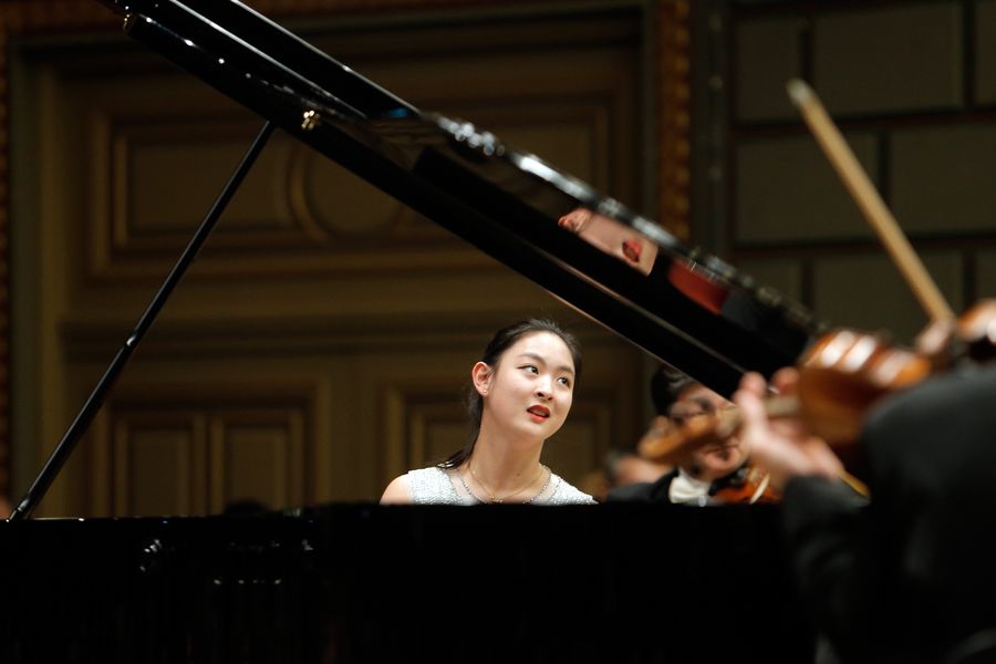 Chinese pianist Wang Yalun plays the piano with China Philharmonic Orchestra during a concert hosted by the Romanian Athenaeum in Bucharest, capital of Romania, Jan. 20, 2020.(Photo by Cristian Cristel/Xinhua)