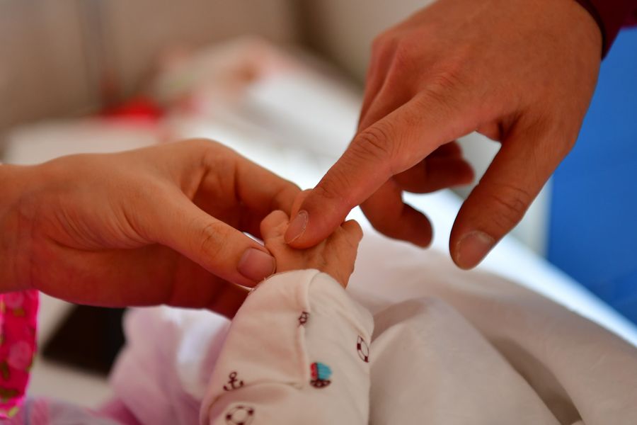 Hao Tiedan (R) and his wife Zhang Saihong touches their daughter's hand at a hospital in Taiyuan, north China's Shanxi Province, Feb. 4, 2020. (Xinhua/Cao Yang)