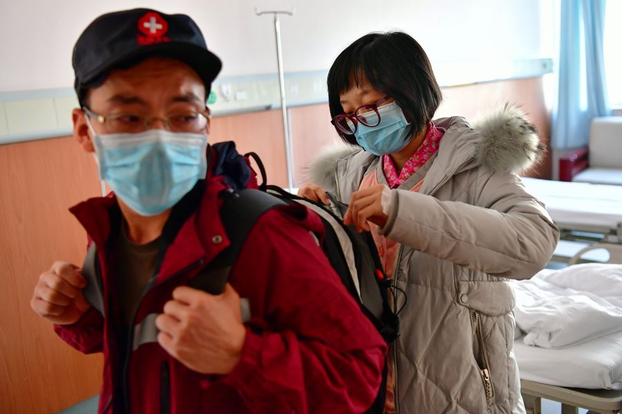 Zhang Saihong helps her husband Hao Tiedan pack his bag in a hospital in Taiyuan, north China's Shanxi Province, Feb. 4, 2020. (Xinhua/Cao Yang)