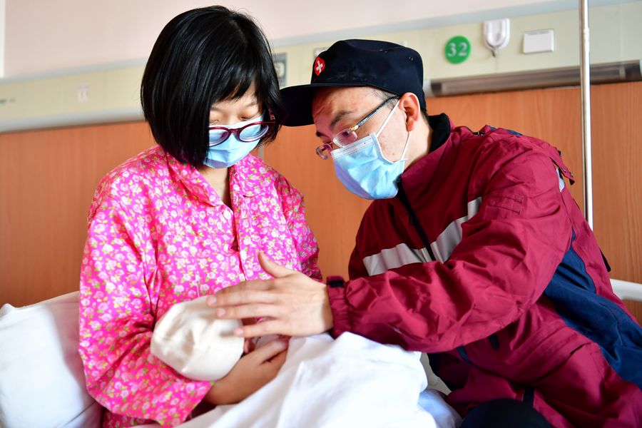 Hao Tiedan holds his daughter in hospital in Taiyuan, north China's Shanxi Province, Feb. 4, 2020.(Xinhua/Cao Yang)