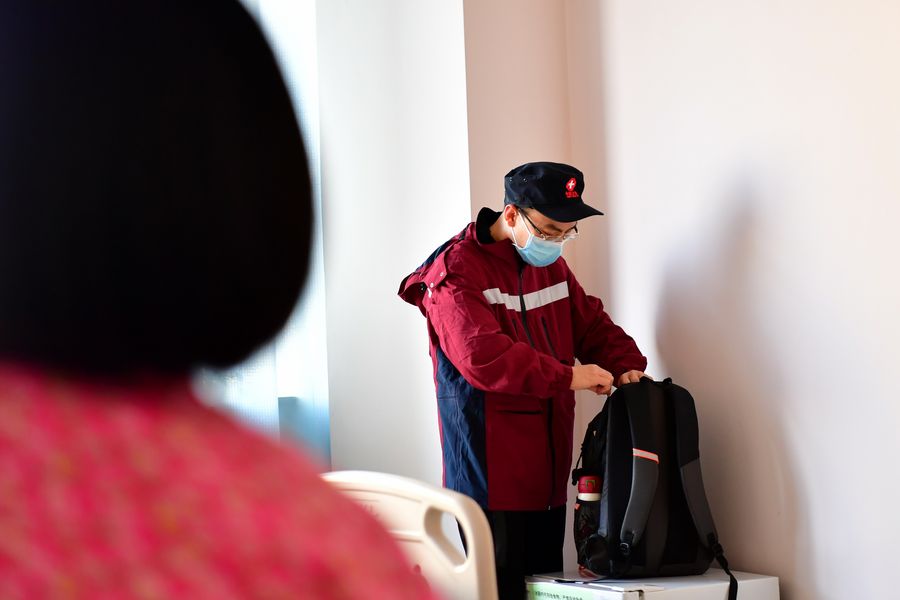 Hao Tiedan packs his bag at a hospital in Taiyuan, north China's Shanxi Province, Feb. 4, 2020. (Xinhua/Cao Yang)