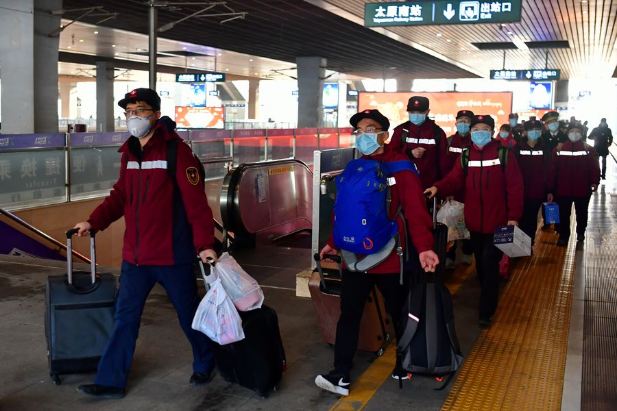 Hao Tiedan (2nd L) and his team members walk to board a train at Taiyuan South Railway Station in Taiyuan, north China's Shanxi Province, Feb. 5, 2020. (Xinhua/Cao Yang)