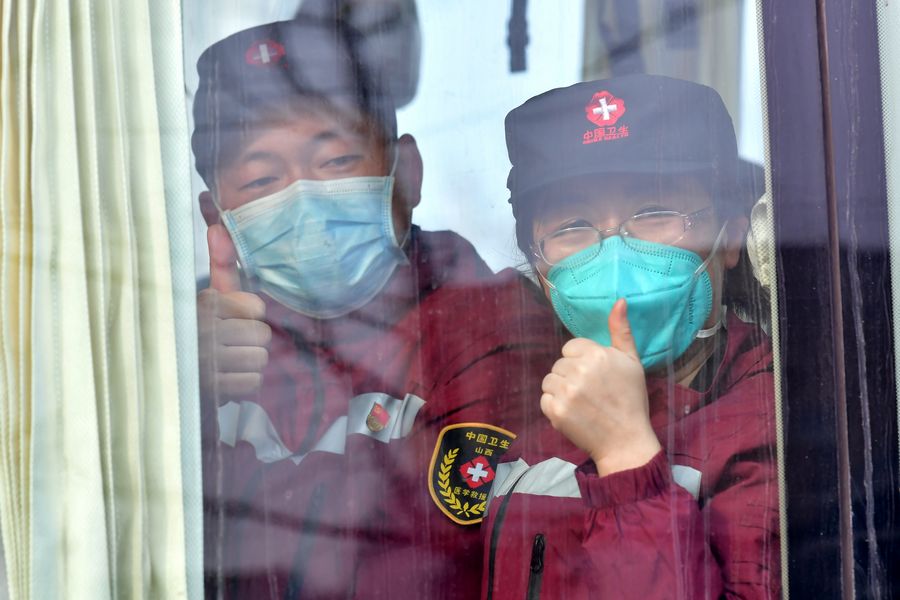 Medical team members say goodbye on a bus heading for the train station in Taiyuan, north China's Shanxi Province, Feb. 5, 2020. (Xinhua/Cao Yang)