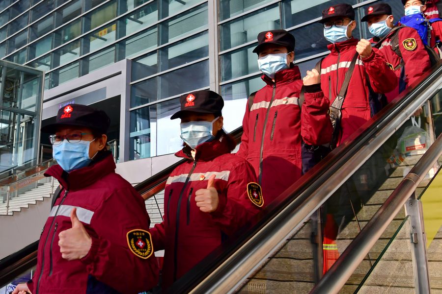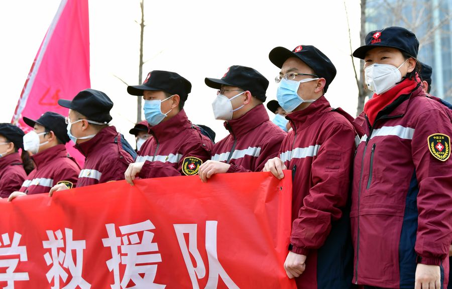 Medical team members are seen on a ceremony before leaving for Hubei Province in Taiyuan, north China's Shanxi Province, Feb. 5, 2020. (Xinhua/Cao Yang)