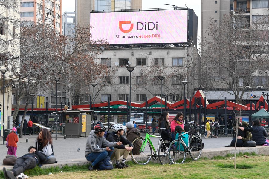 An outdoor screen showing advertisement of DiDi Chuxing is seen in Chile's capital Santiago, Aug. 6, 2019. (Xinhua/Jorge Villegas)