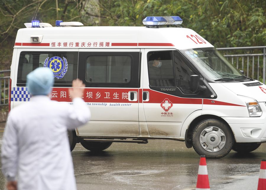 A medical staff waves goodbye to people discharged from medical observation at the People's Hospital in Yunyang County, southwest China's Chongqing, Feb. 5, 2020. (Xinhua/Wang Quanchao)