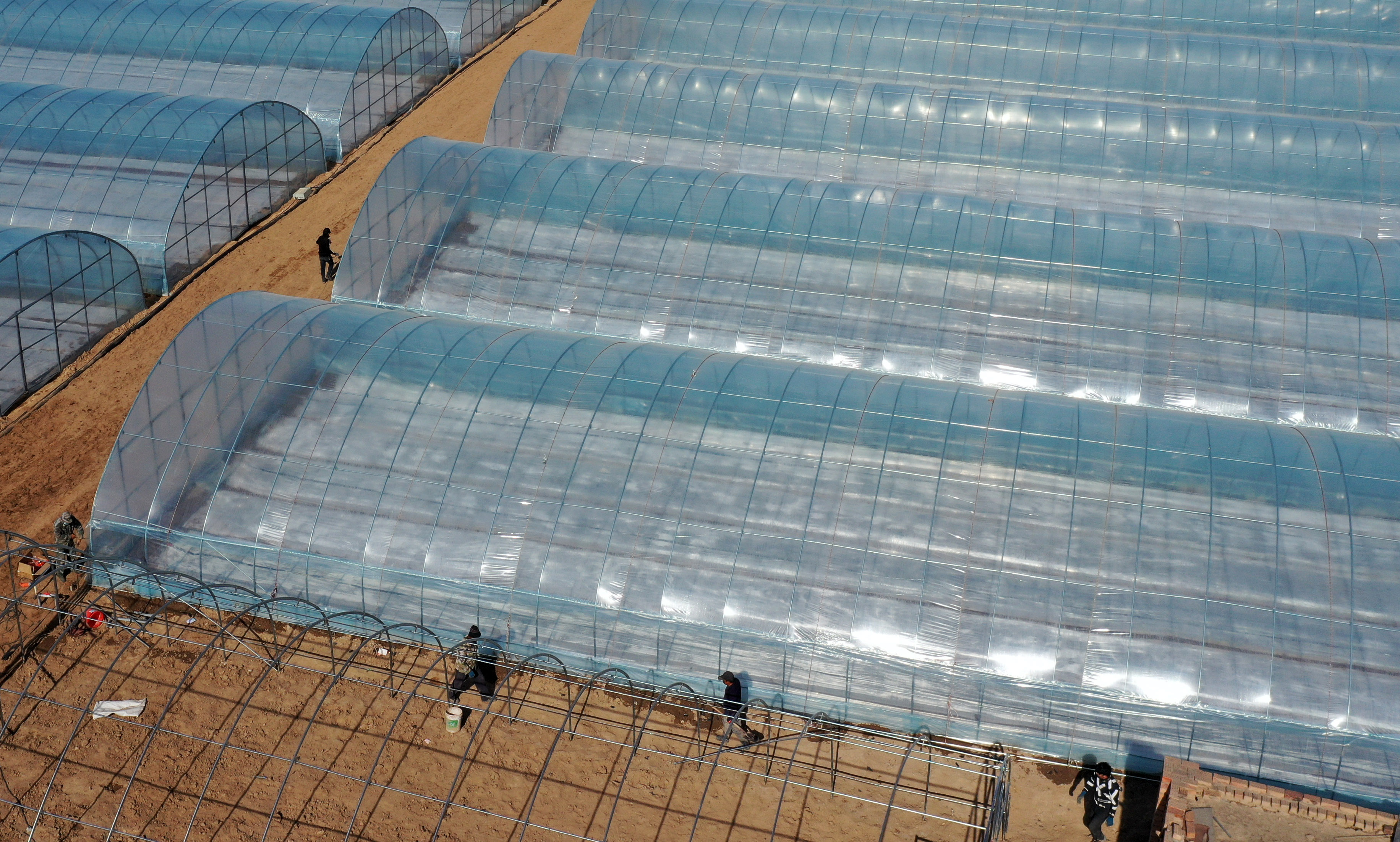 Aerial photo taken on Feb. 22, 2020 shows vegetable seedling greenhouses at Lanfeng Village of Ligang Town, Helan County, Yinchuan, northwest China's Ningxia Hui Autonomous Region. (Xinhua/Wang Peng)