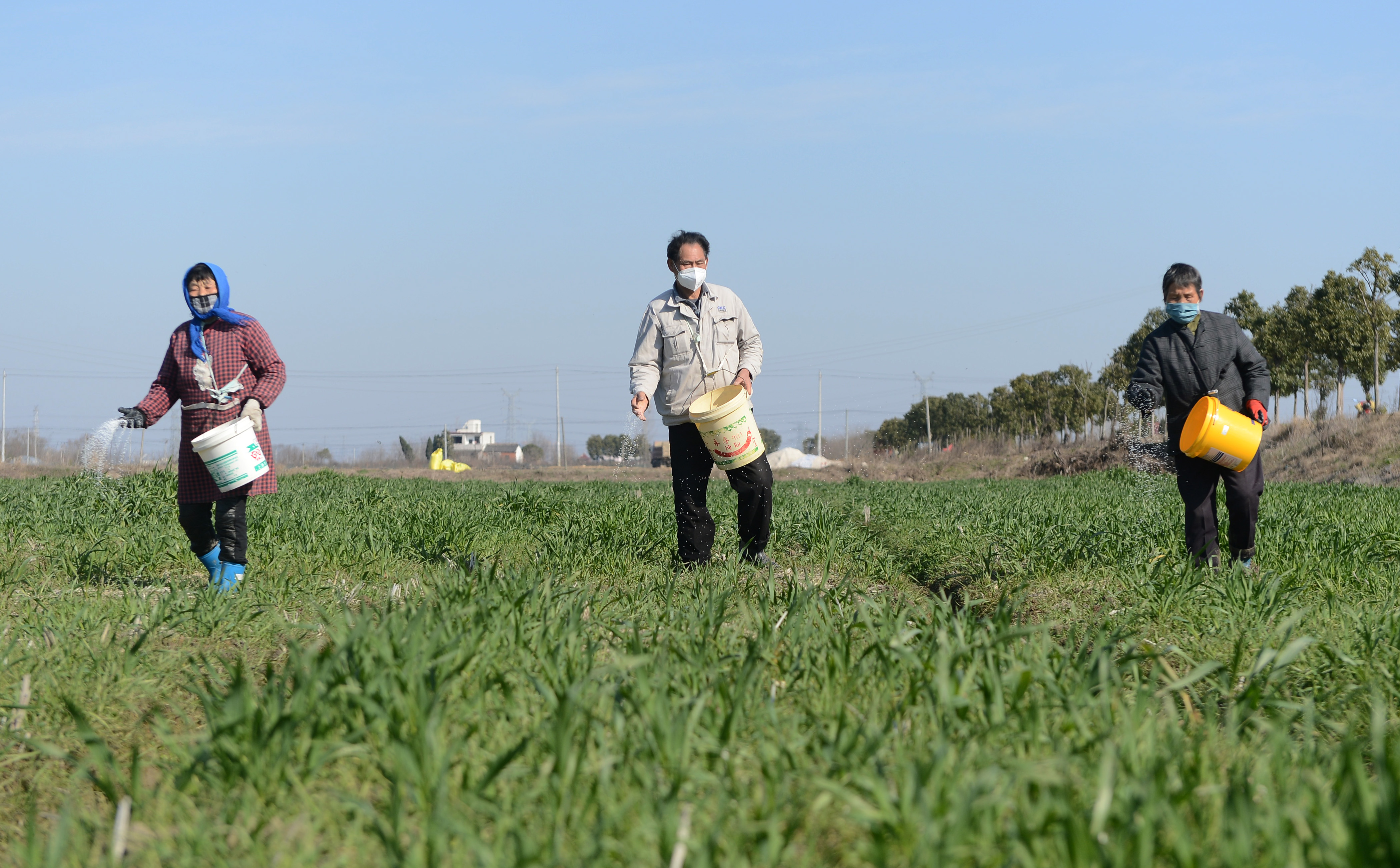 Villagers fertilize wheat at Linhe Township in Feidong County, east China's Anhui Province, Feb. 18, 2020. (Xinhua/Han Xiaoyu)