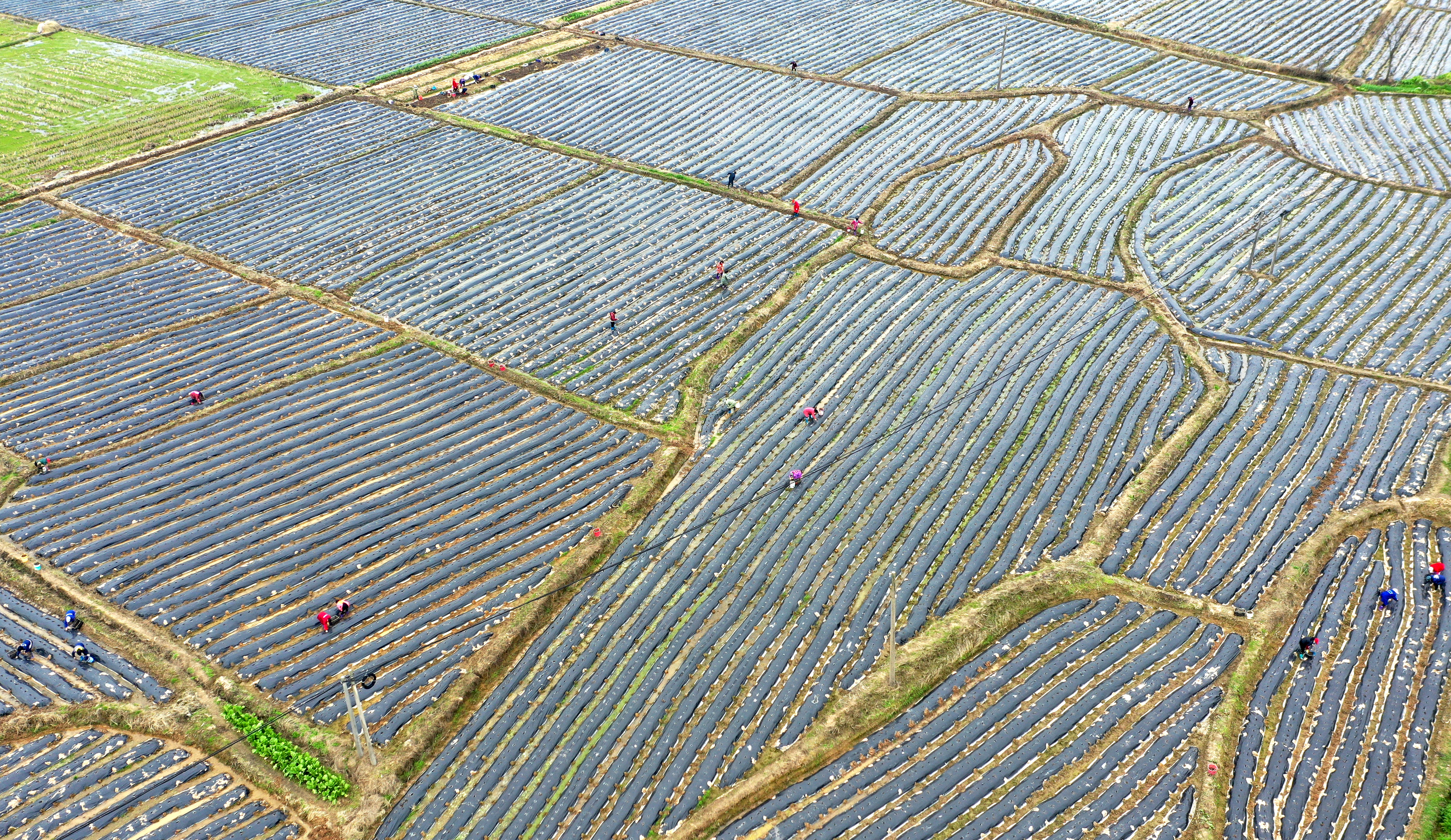 Aerial photo taken on Feb. 19, 2020 shows villagers working in fields at the Qidu Township of Ji'an, east China's Jiangxi Province. (Photo by Liu Haojun/Xinhua)