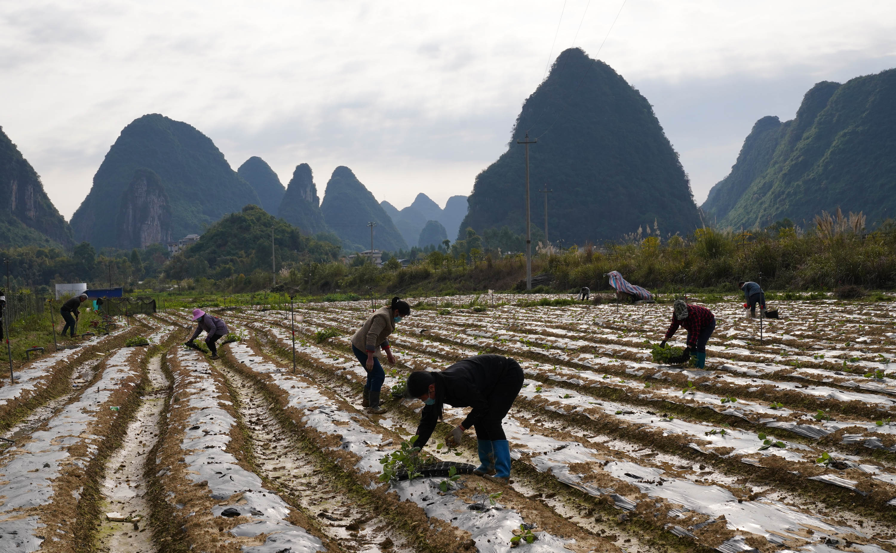 Villagers plant the eggplant seedlings in fields at Rongshui Township of Rongshui Miao Autonomous County, south China's Guangxi Zhuang Autonomous Region, Feb. 18, 2020. (Photo by Long Linzhi/Xinhua)