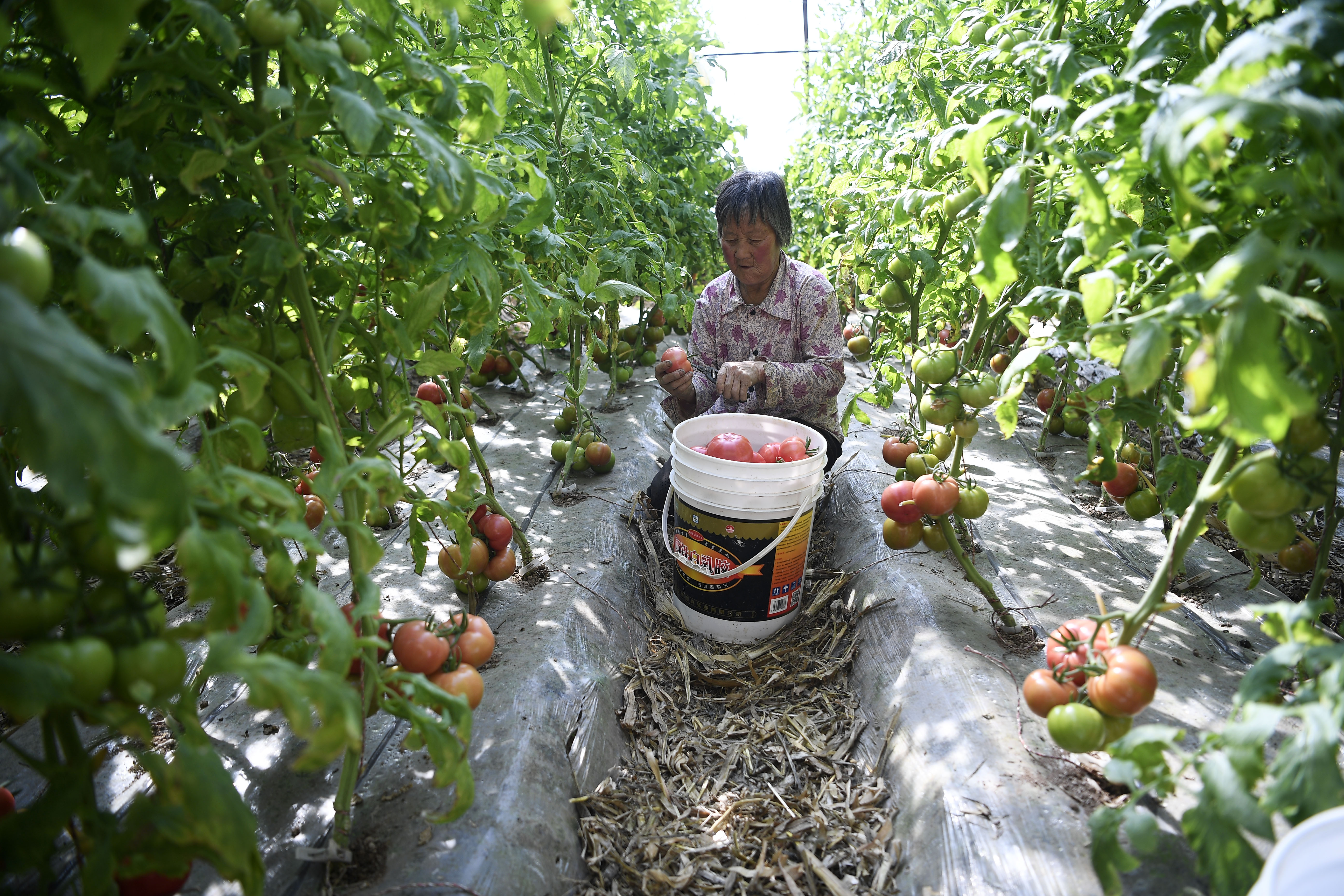 A farmer picks tomatoes at a modern agricultural park in Helan County, Yinchuan, northwest China's Ningxia Hui Autonomous Region, Feb. 22, 2020. (Xinhua/Wang Peng)