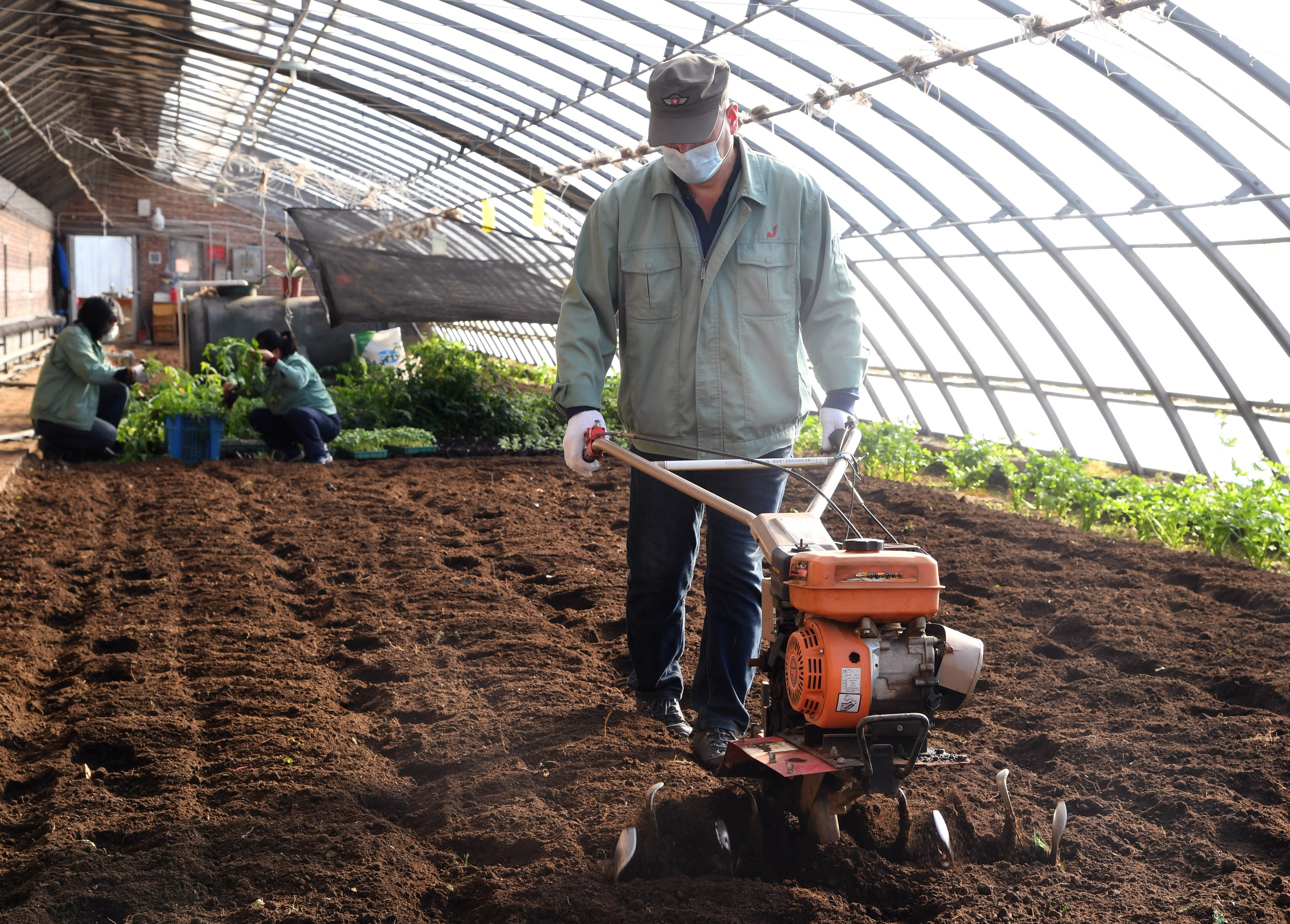 A staff member ploughs at a vegetable planting base in Nangong Village of Wangzuo Town in Fengtai District of Beijing, capital of China, Feb. 22, 2020. (Xinhua/Ren Chao)
