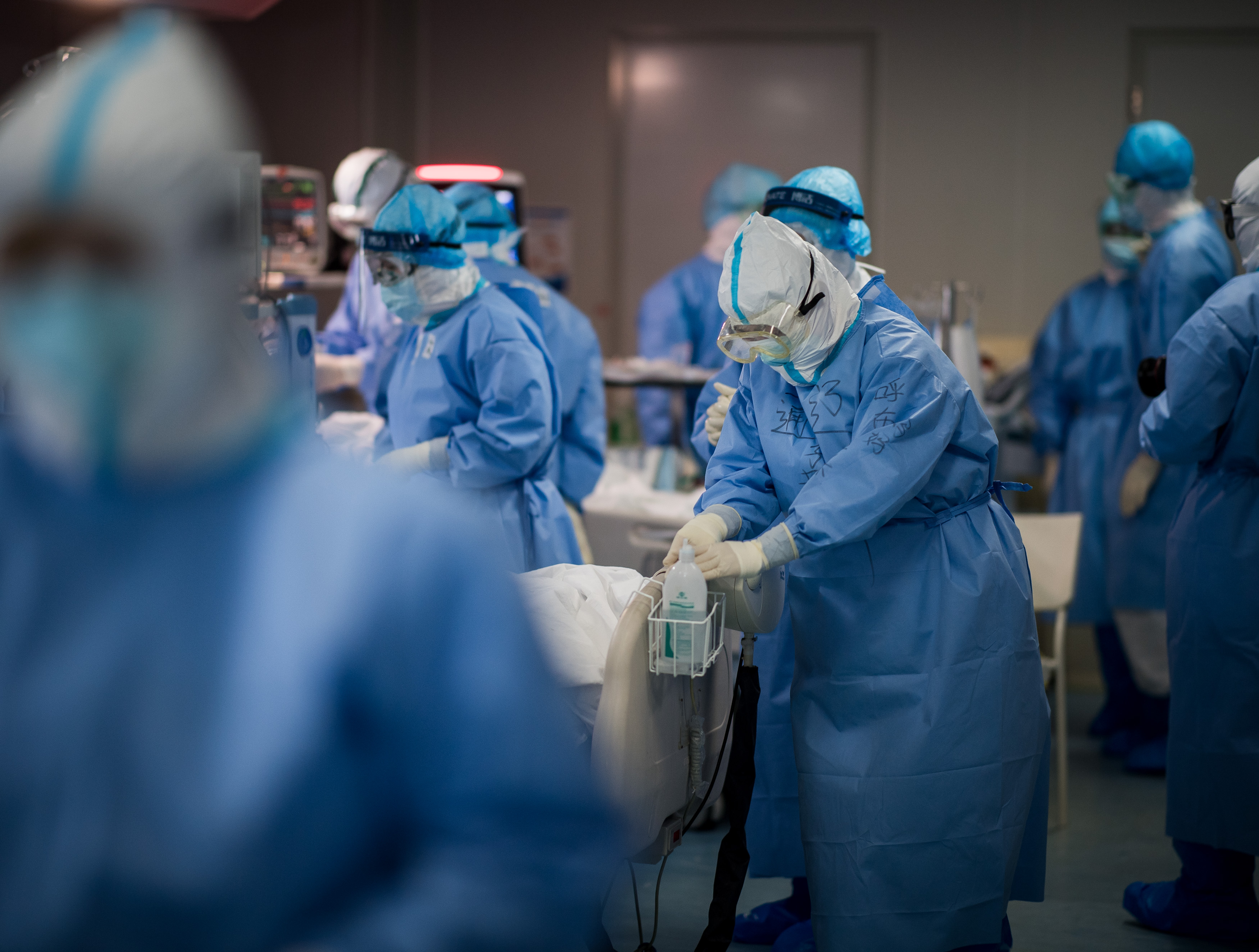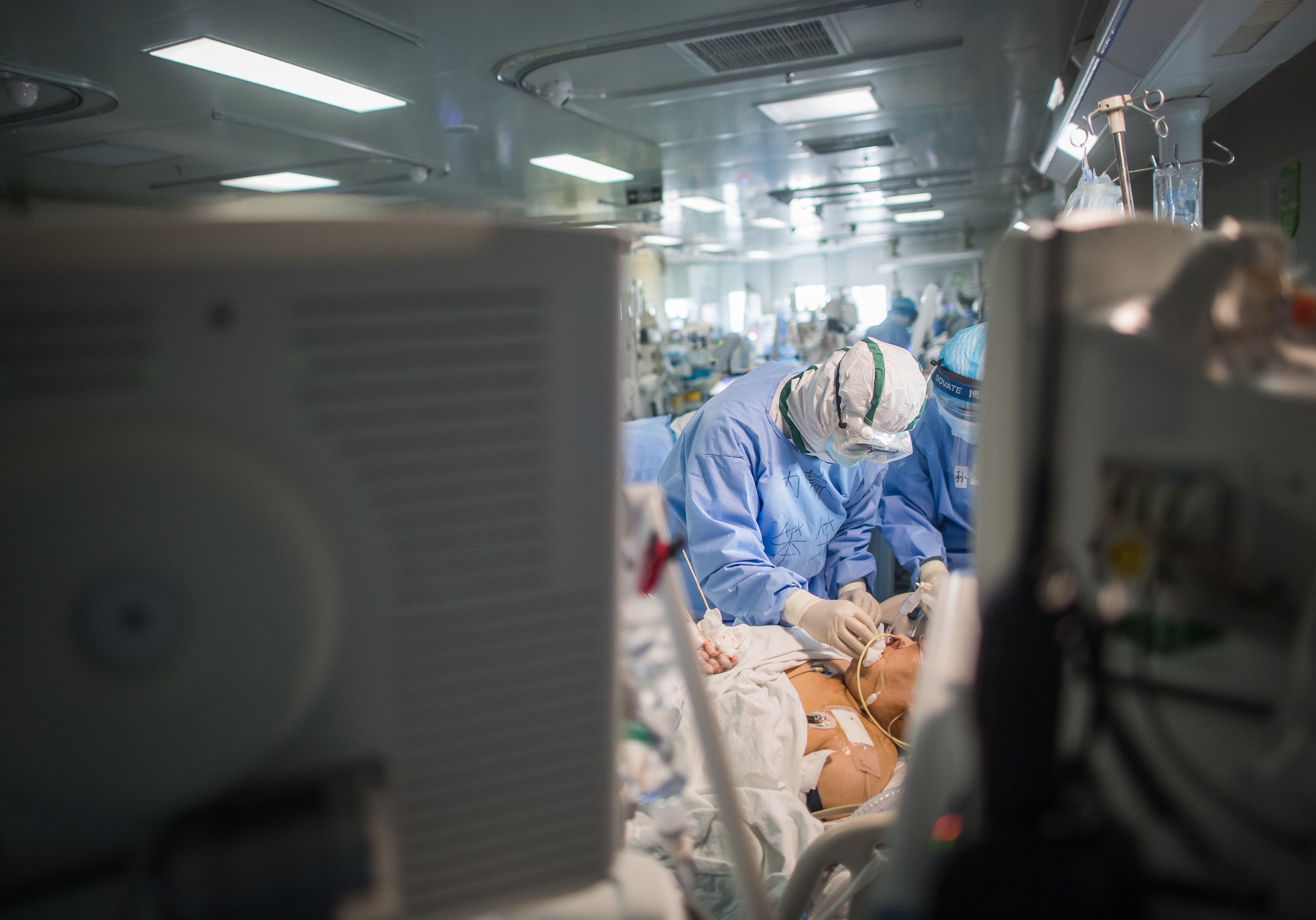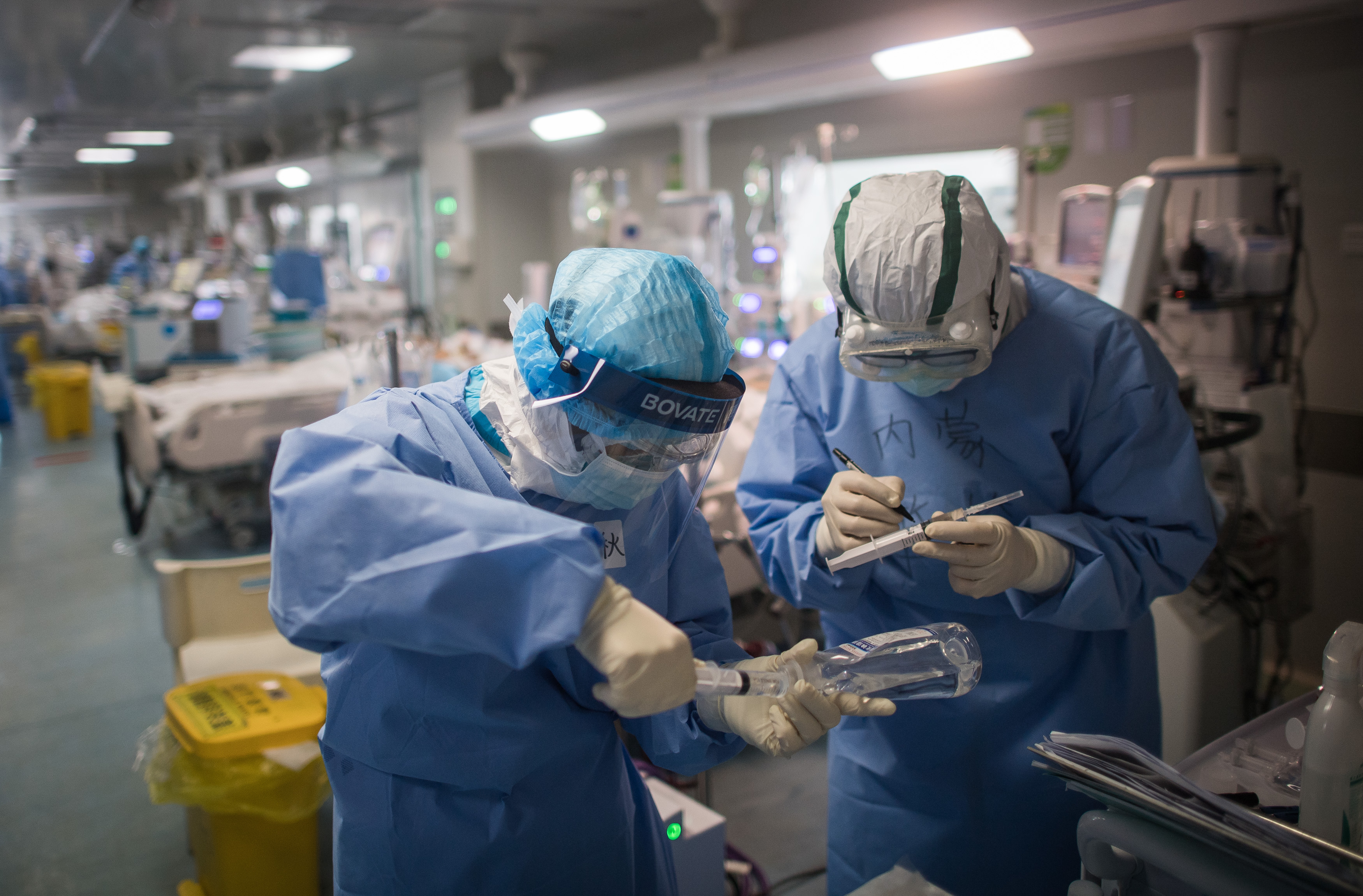 Medical workers are busy at the ICU (intensive care unit) of Wuhan pulmonary hospital in Wuhan, central China's Hubei Province, March 19, 2020. (Xinhua/Xiao Yijiu)