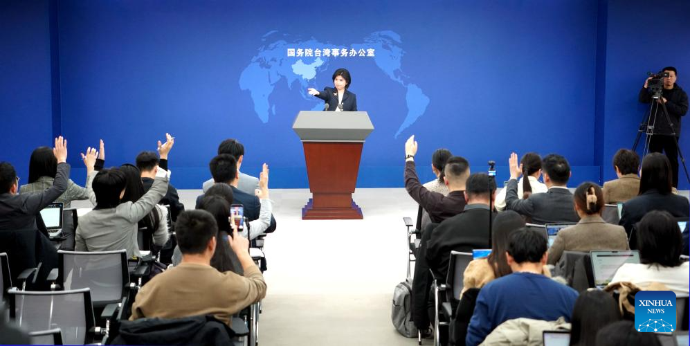 Zhu Fenglian, spokesperson for the State Council Taiwan Affairs Office, gestures at a press conference in Beijing, capital of China, Dec. 17, 2025. (Xinhua/Pan Xu)