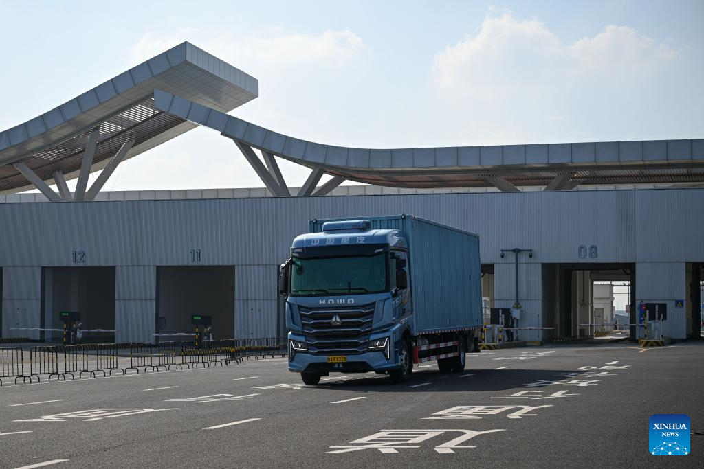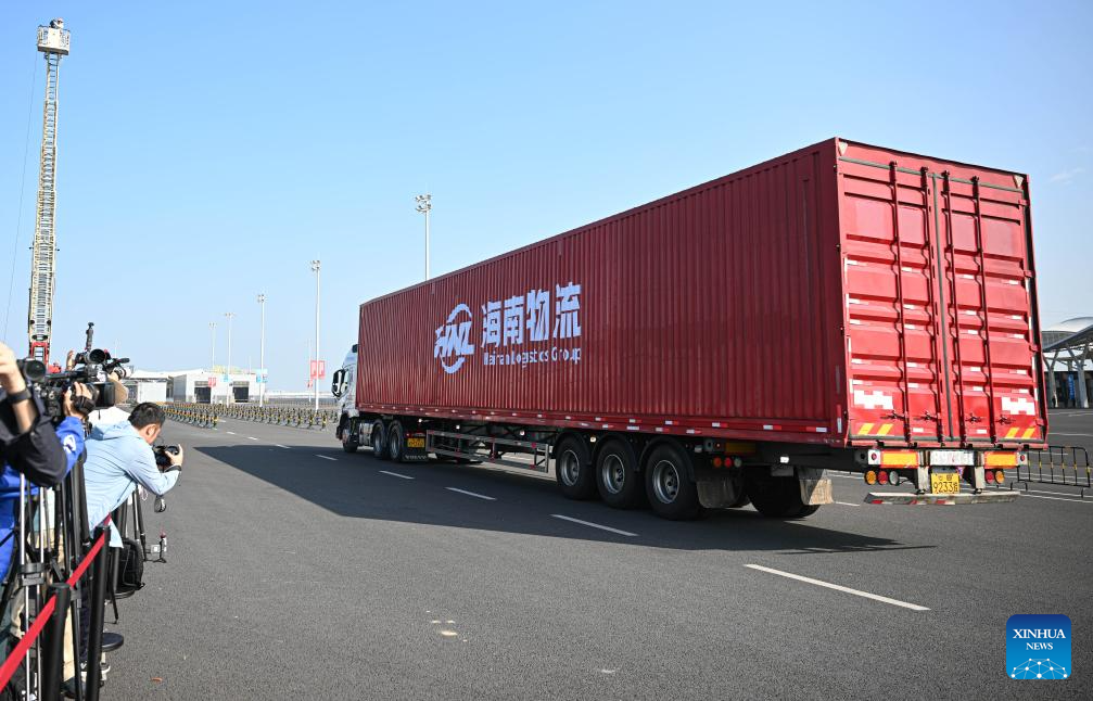 A truck carrying the first batch of goods that completed customs clearance is pictured at a centralized inspection area in Xinhai Port and Nangang Port, two "second line" customs ports, in Haikou, south China's Hainan Province, Dec. 18, 2025. China on Thursday launched island-wide special customs operations in the Hainan Free Trade Port (FTP).