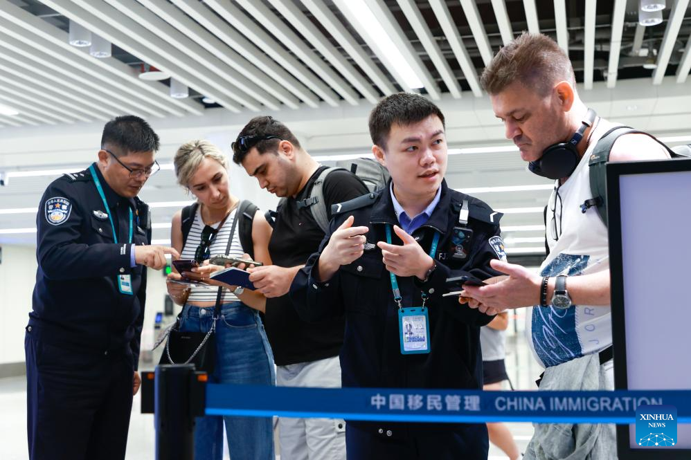 (251218) -- HAIKOU, Dec. 18, 2025 (Xinhua) -- Police officers work to help inbound passengers at Haikou Meilan International Airport in Haikou, south China's Hainan Province, Dec. 18, 2025. China on Thursday launched island-wide special customs operations in the Hainan Free Trade Port (FTP). (Xinhua)