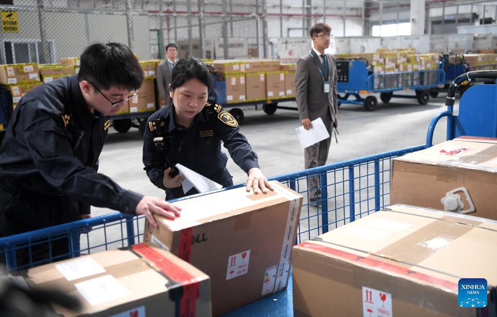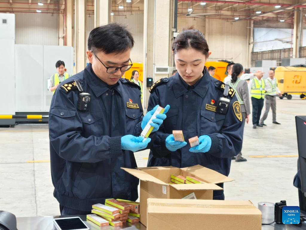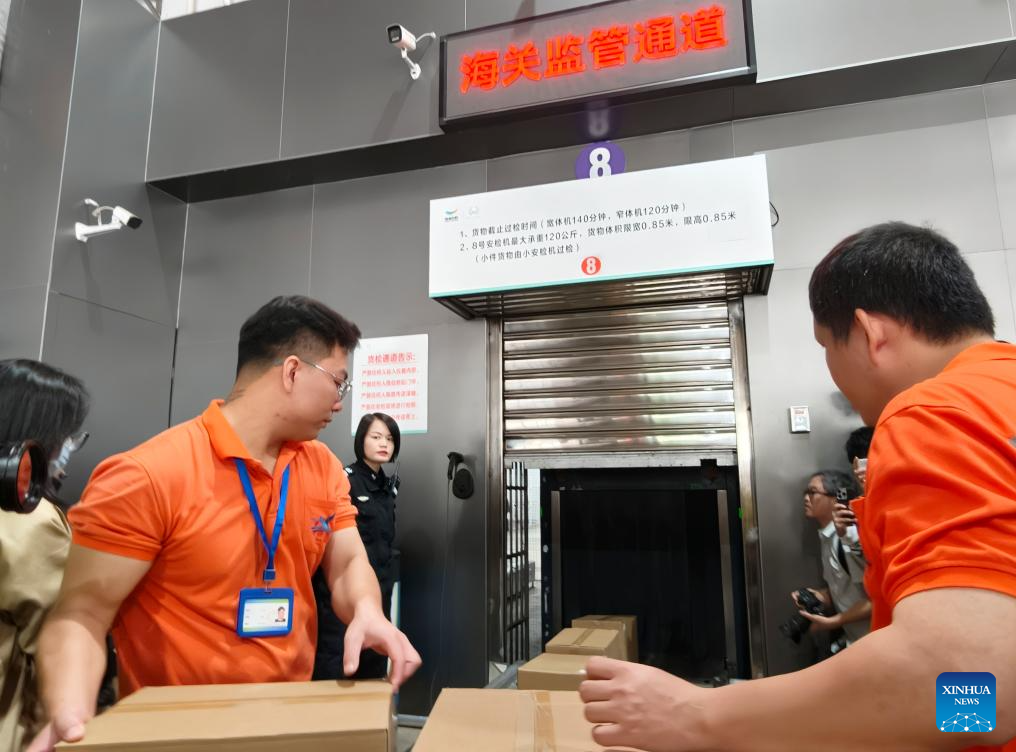 Staff members of customs inspect the first batch of duty-free goods after the launch of island-wide special customs operations in the Hainan Free Trade Port (FTP) at Sanya Phoenix International Airport in Sanya, south China's Hainan Province, Dec. 18, 2025. China on Thursday launched island-wide special customs operations in the Hainan Free Trade Port (FTP). (Xinhua/Zhao Yingquan)