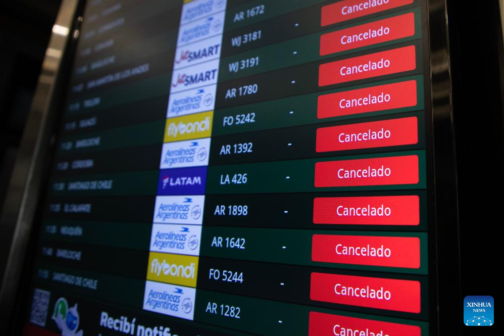 A screen displays canceled flights in Jorge Newbery airport, in Buenos Aires, Argentina, on Feb. 19, 2026. Argentina's main labor unions started a nationwide 24-hour strike on Thursday in protest against a labor reform bill under debate in the Chamber of Deputies, after it was approved by the Senate on Feb. 12. (Photo by Martin Zabala/Xinhua)