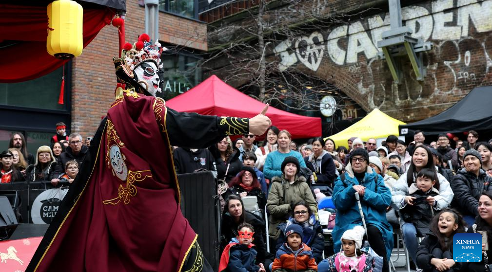 People watch Sichuan Opera face-changing performace during a Chinese New Year celebration at Camden Market in London, Britain, Feb. 21, 2026. (Xinhua/Li Ying)