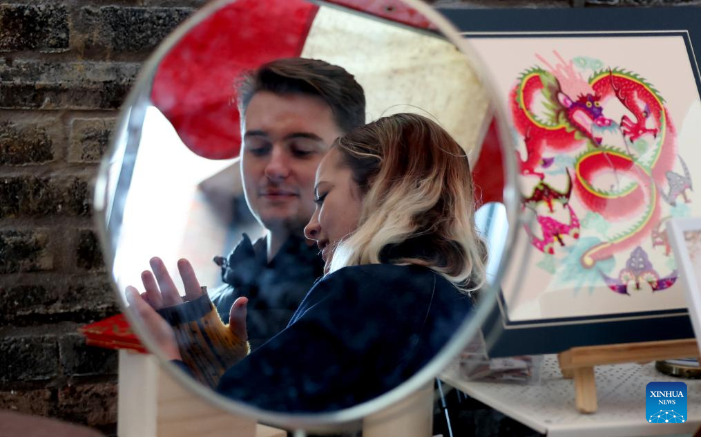A man tries Chinese calligraphy during a Chinese New Year celebration at Camden Market in London, Britain, Feb. 21, 2026. (Xinhua/Li Ying)