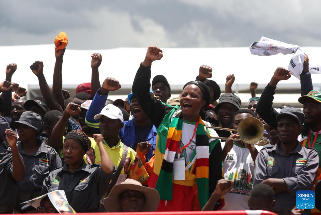 People cheer at an event in celebration of the National Youth Day in Mashonaland East Province, Zimbabwe, on Feb. 21, 2026. Thousands of young Zimbabweans on Saturday gathered in Marondera District of Mashonaland East Province to mark the National Youth Day to honor the role of young people in national development. (Xinhua)