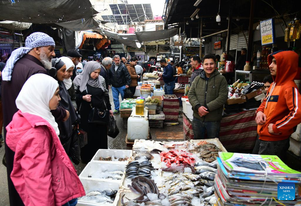 Syrians buy frozen fish at a fish market in Damascus, Syria, Feb. 23, 2026. Popular markets in Damascus have become crowded during the holy month of Ramadan, with shoppers searching for cheaper options amid economic hardship. (Photo by Ammar Safarjalani/Xinhua)