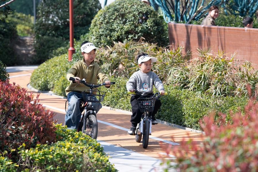 Children ride bicycles at a pocket park built on a former railway station in Yaohai District of Hefei, east China's Anhui Province, March 14, 2026. (Xinhua/Zhang Duan)