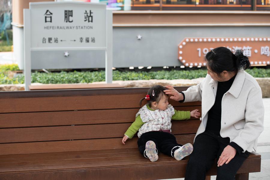 A woman and a child have fun at a pocket park built on a former railway station in Yaohai District of Hefei, east China's Anhui Province, March 11, 2026. (Xinhua/Zhang Duan)