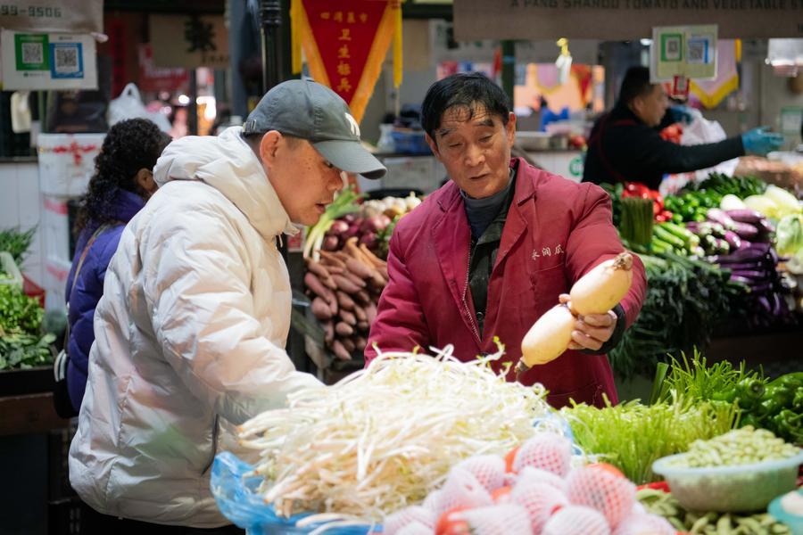 A citizen (L) buys lotus roots at the Siwan vegetable market in Luyang District of Hefei, east China's Anhui Province, March 11, 2026. (Xinhua/Zhang Duan)■