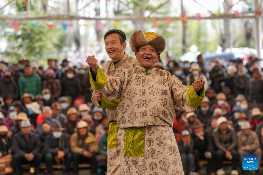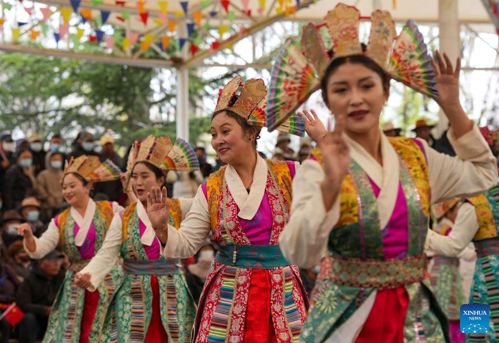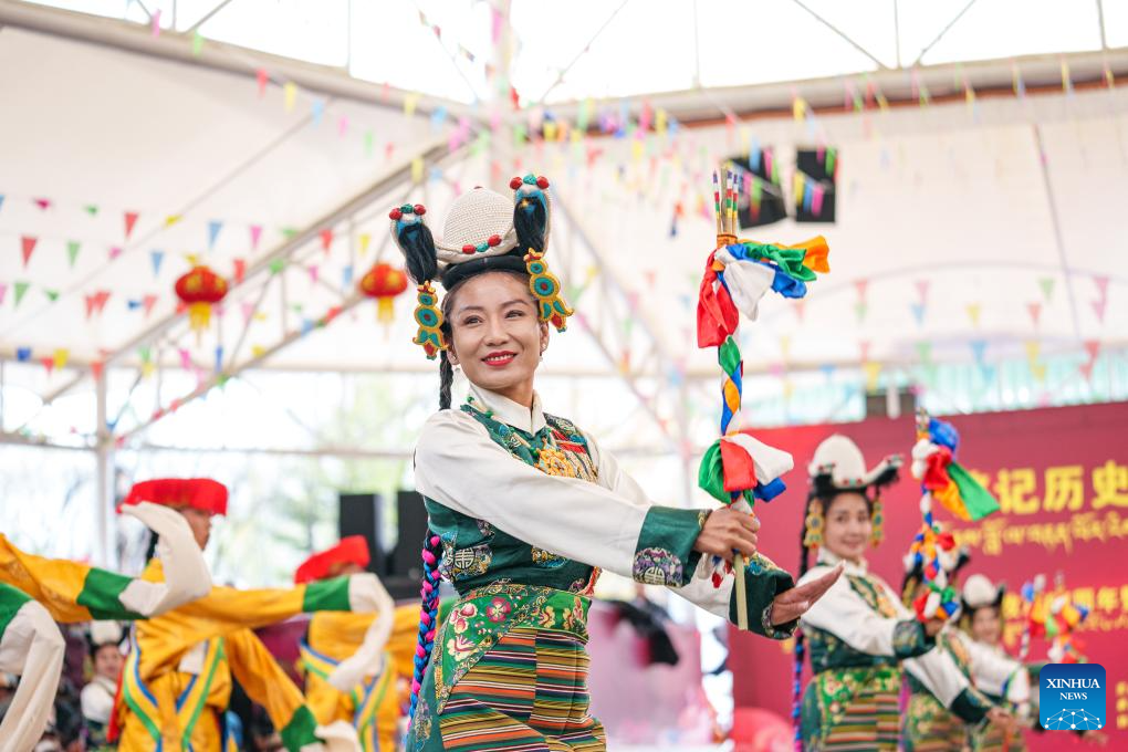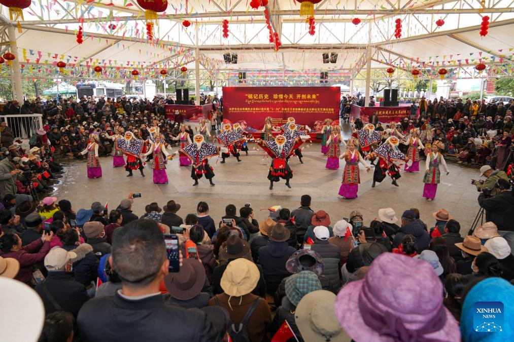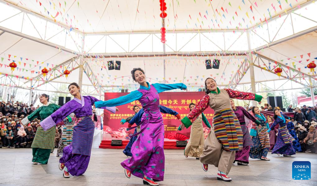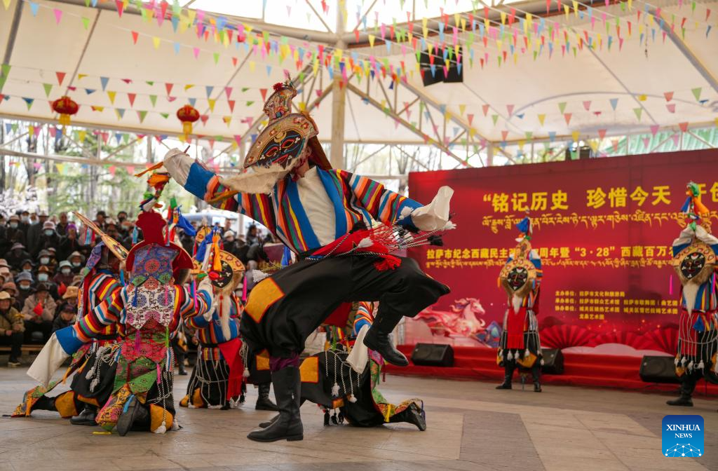 A performance is staged in celebration of the Serfs' Emancipation Day at a park in Lhasa, capital of southwest China's Xizang Autonomous Region, March 28, 2026.