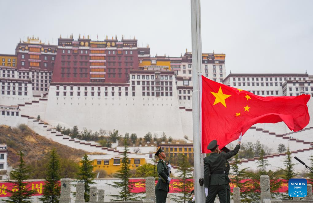 A flag-raising ceremony is held to celebrate the Serfs' Emancipation Day at the square in front of the Potala Palace in Lhasa, capital of southwest China's Xizang Autonomous Region, March 28, 2026.