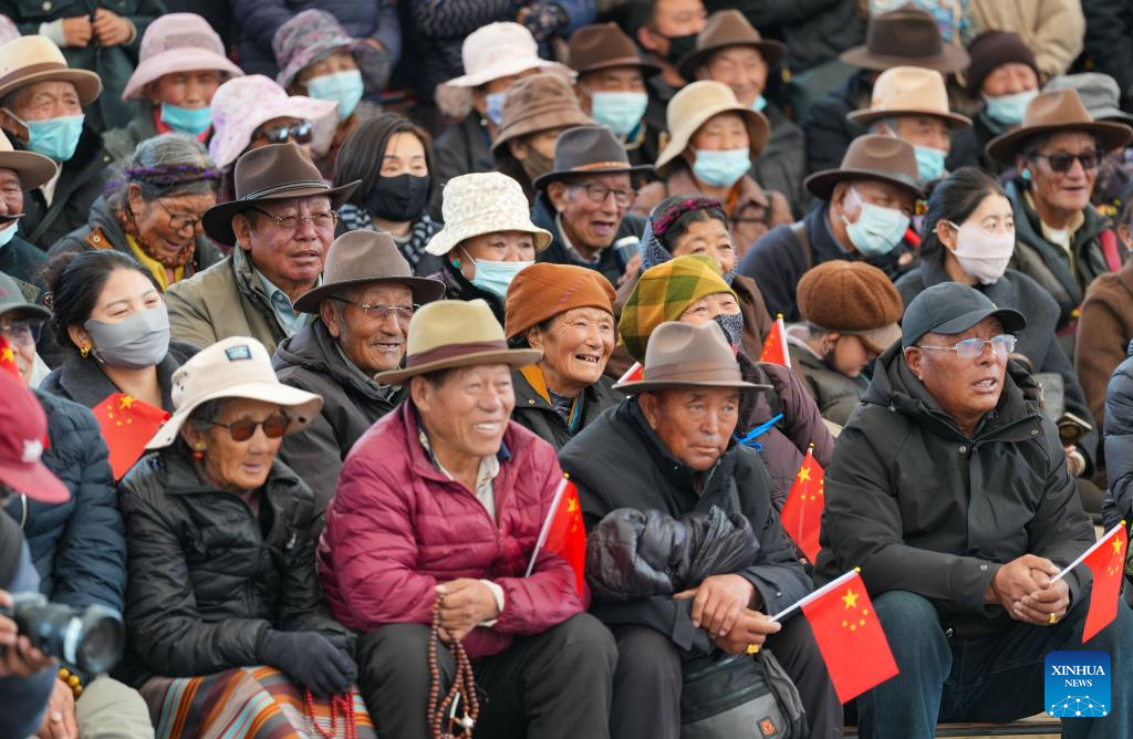 People watch a performance in celebration of the Serfs' Emancipation Day at a park in Lhasa, capital of southwest China's Xizang Autonomous Region, March 28, 2026.
