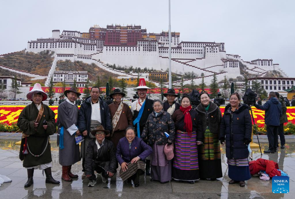 People pose for photos at the square in front of the Potala Palace in Lhasa, capital of southwest China's Xizang Autonomous Region, March 28, 2026.