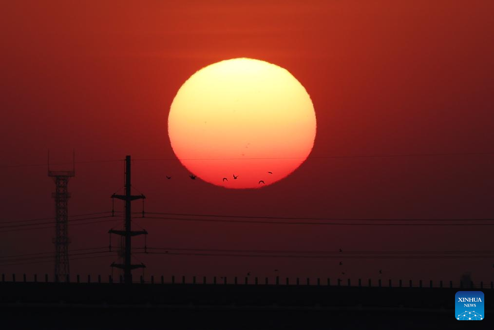 This photo taken on April 2, 2026 shows the sunrise scenery at a migratory bird habitat on the Yalu River estuary in Dandong, northeast China's Liaoning Province. (Xinhua/Li Gang)