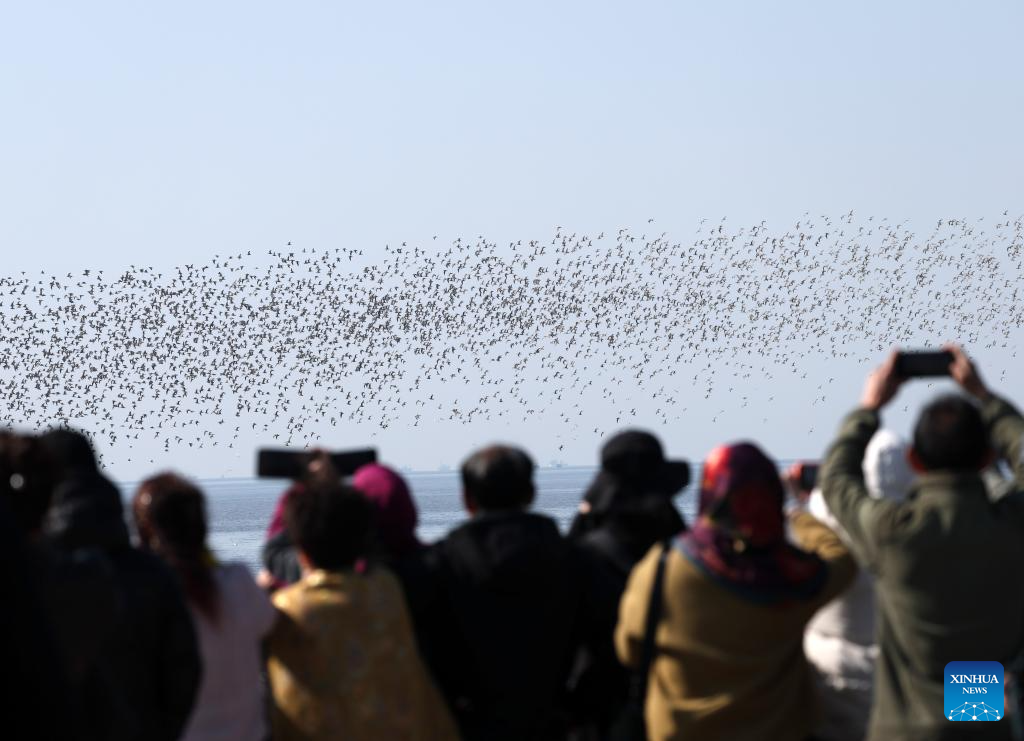 Tourists view migratory birds at a migratory bird habitat on the Yalu River estuary in Dandong, northeast China's Liaoning Province, April 2, 2026. (Xinhua/Li Gang)