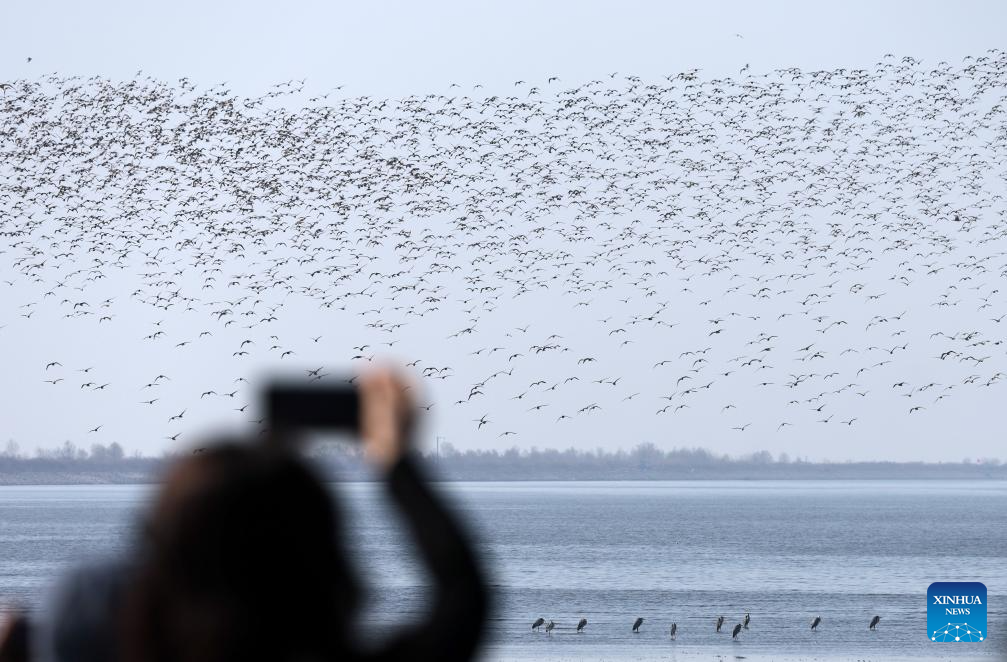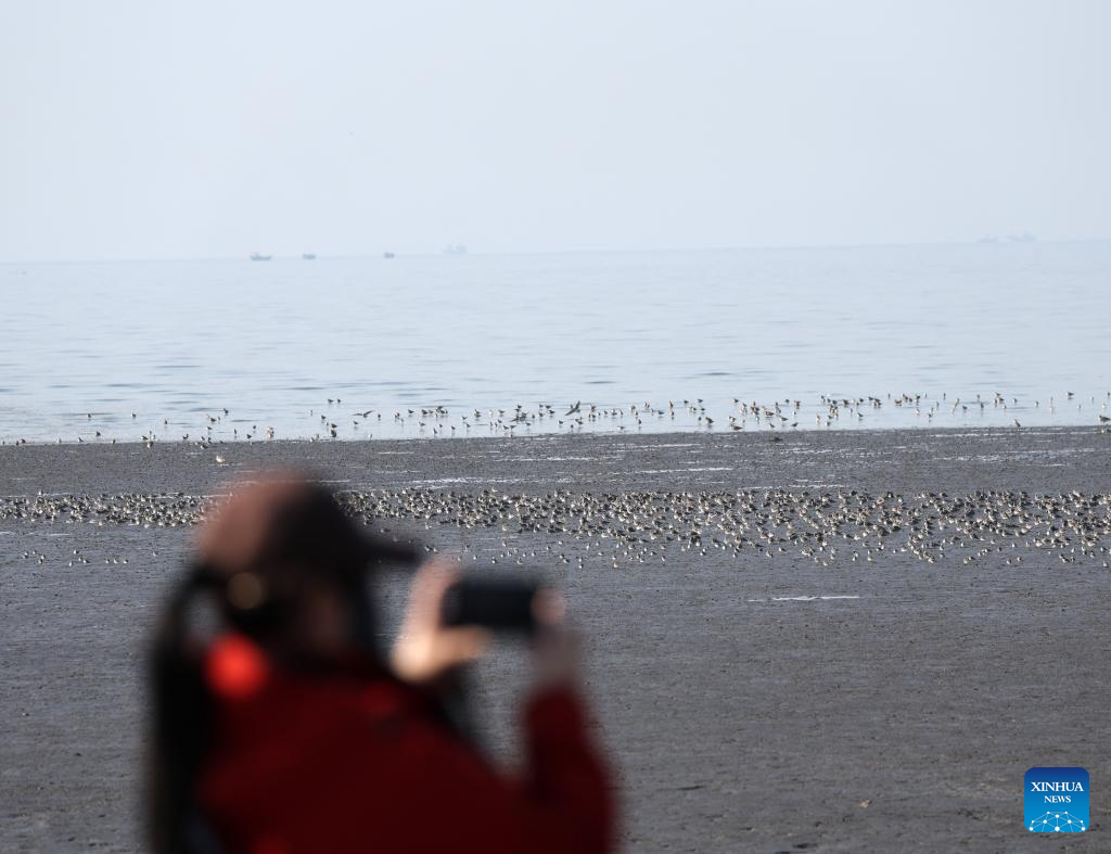 A tourist takes photos of migratory birds at a migratory bird habitat on the Yalu River estuary in Dandong, northeast China's Liaoning Province, April 2, 2026. (Xinhua/Li Gang)