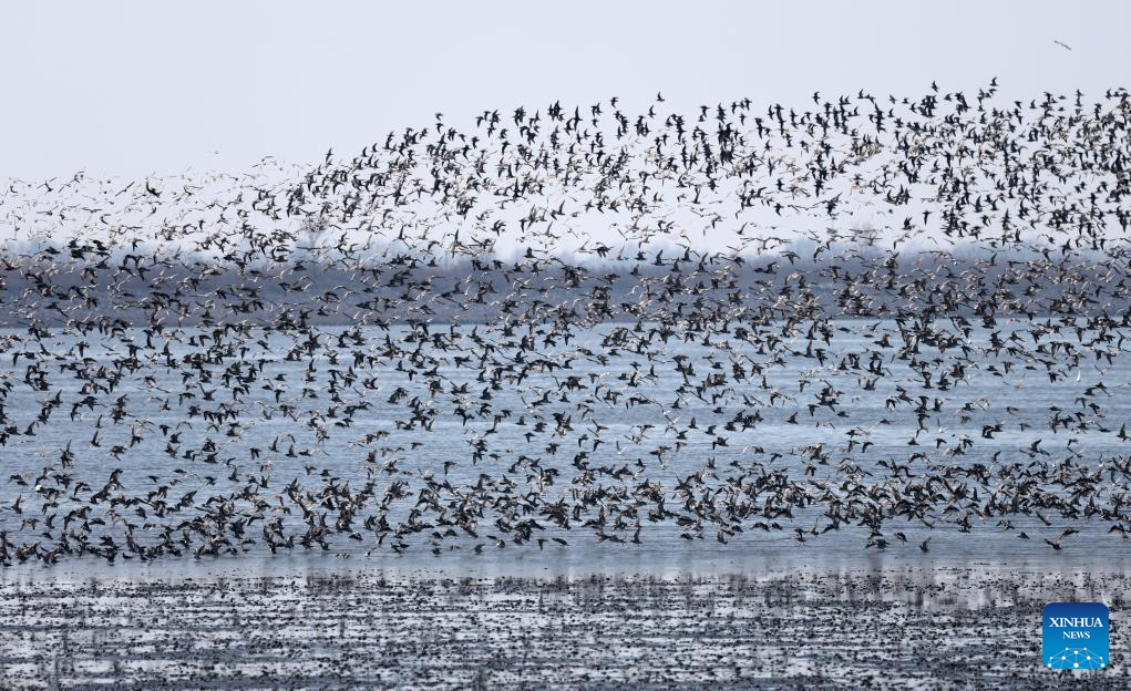 This photo taken on April 2, 2026 shows migratory birds at a migratory bird habitat on the Yalu River estuary in Dandong, northeast China's Liaoning Province. (Xinhua/Li Gang)