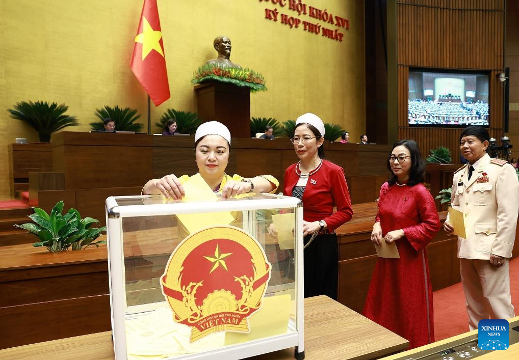 A delegate casts her vote to elect state president of Vietnam during the first session of the 16th National Assembly in Hanoi, Vietnam, April 7, 2026. To Lam, general secretary of the Communist Party of Vietnam Central Committee, was elected Vietnam's state president at the first session of the 16th National Assembly, the country's top legislature, on Tuesday. (VNA via Xinhua)