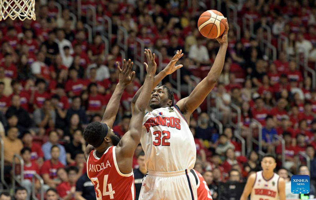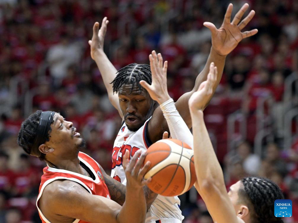 Jordy Tshimanga (R) of XAC Broncos shoots during the 2026 Basketball Champions League Asia-East group phase group B match between South China Athletic and XAC Broncos in Hong Kong, south China, April 6, 2026. (Xinhua/Lo Ping Fai)