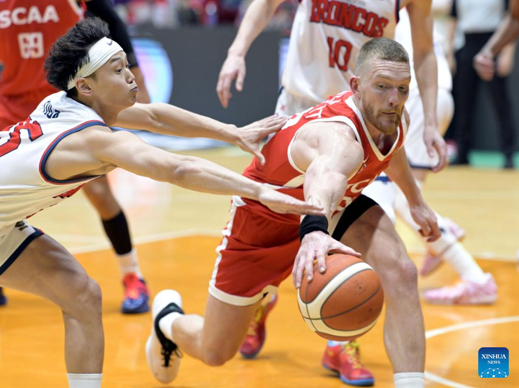 Barsbold Baatar Erdene (R) of XAC Broncos dribbles during the 2026 Basketball Champions League Asia-East group phase group B match between South China Athletic and XAC Broncos in Hong Kong, south China, April 6, 2026. (Xinhua/Lo Ping Fai)