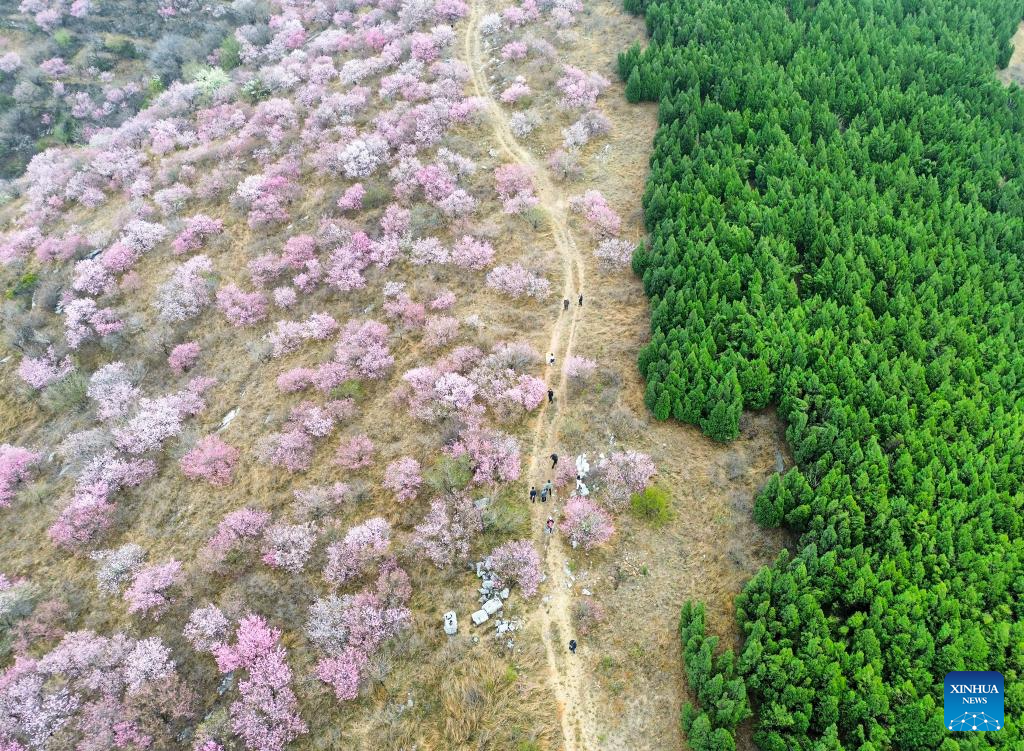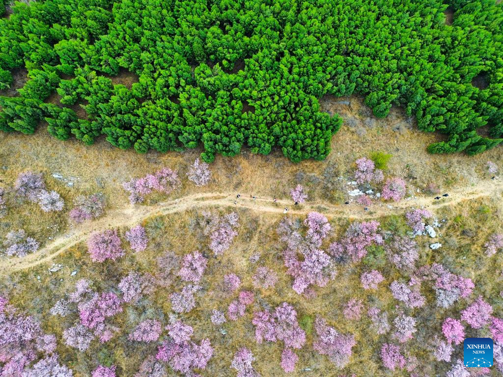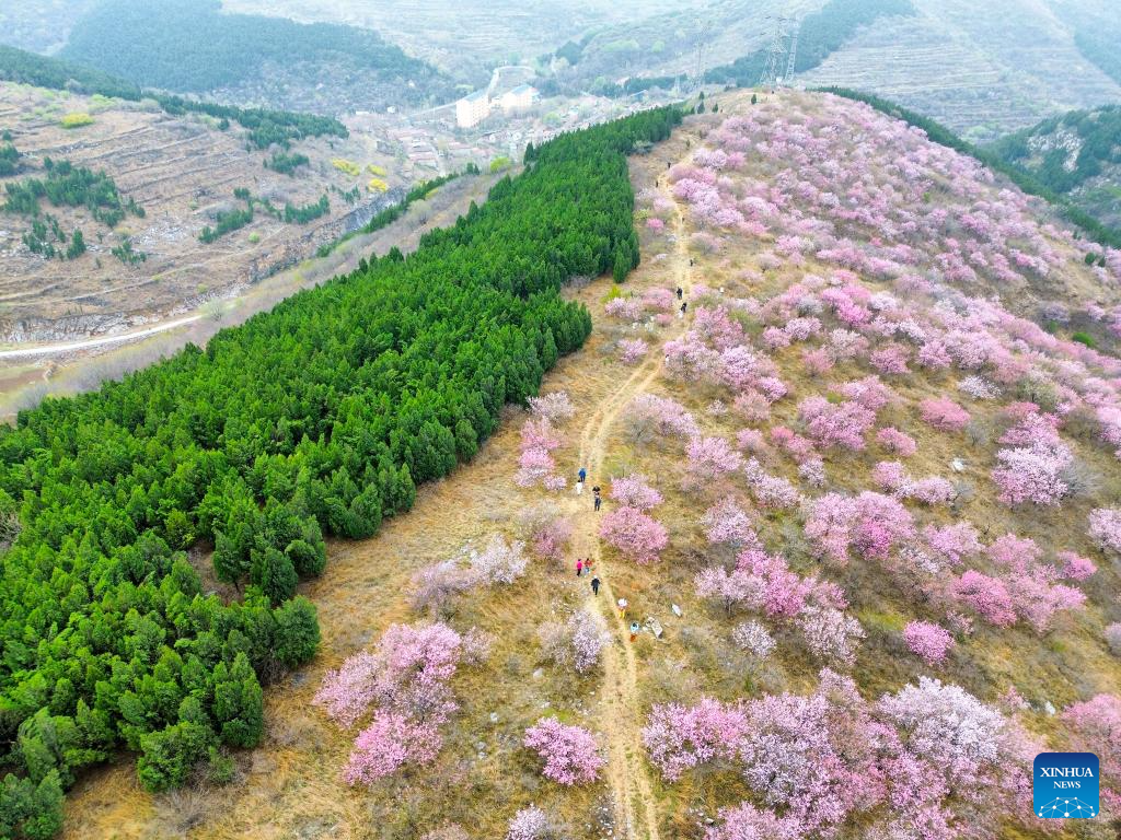 An aerial drone photo taken on April 9, 2026 shows people enjoying peach flowers in Shangjiao Village, Zibo City of east China's Shandong Province. (Xinhua/Zhu Zheng)