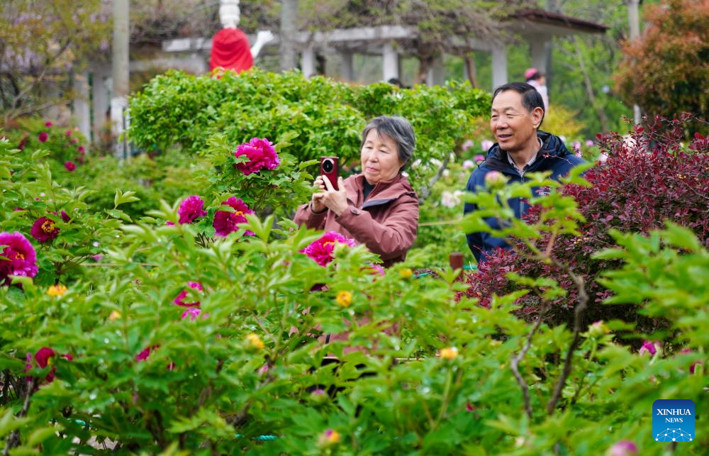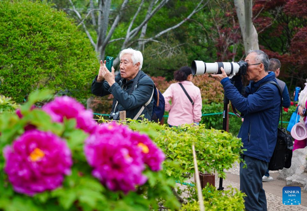People enjoy peony flowers at a park in Jinan, east China's Shandong Province, April 9, 2026. (Xinhua/Xu Suhui)