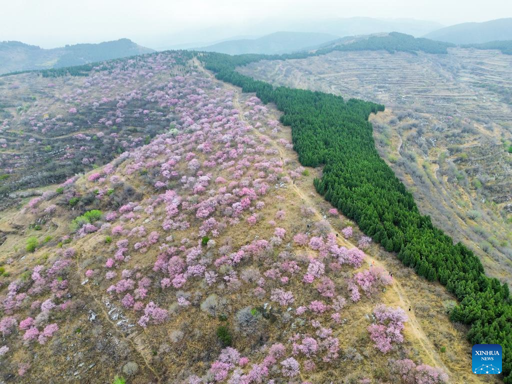 An aerial drone photo taken on April 9, 2026 shows peach trees in Shangjiao Village, Zibo City of east China's Shandong Province. (Xinhua/Zhu Zheng)