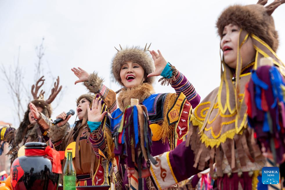A blessing ceremony by performers from the Hezhe ethnic group is held at the Hanjiang festival in Jiamusi, northeast China's Heilongjiang Province, April 10, 2026.