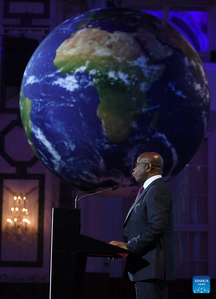 Sierra Leonean President Julius Maada Bio delivers a speech at the International Vienna Energy and Climate Forum in Vienna, Austria, April 9, 2026. Under the theme "Powering Prosperity, Security and Stability," the International Vienna Energy and Climate Forum 2026 opened here on Thursday. (Xinhua/He Canling)