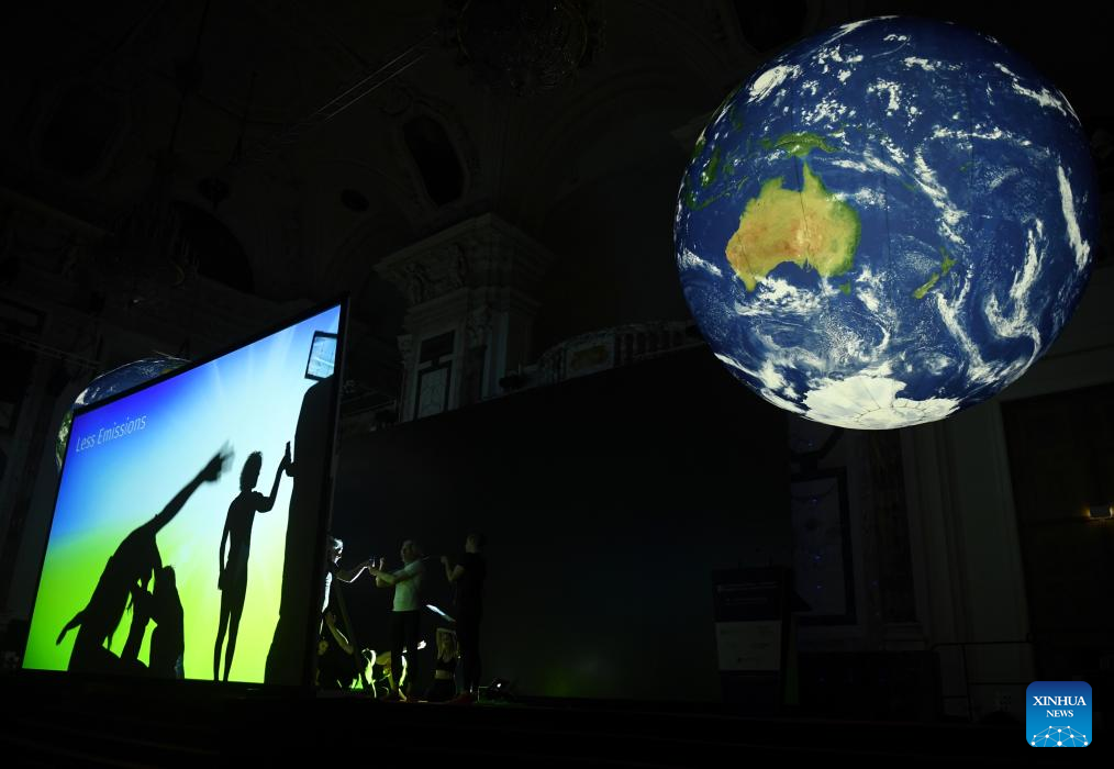 This photo taken on April 9, 2026 shows an art performance at the International Vienna Energy and Climate Forum in Vienna, Austria. Under the theme "Powering Prosperity, Security and Stability," the International Vienna Energy and Climate Forum 2026 opened here on Thursday. (Xinhua/He Canling)