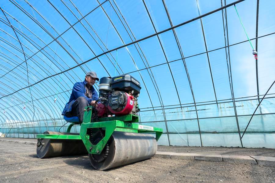 A farmer levels seedbed soil in a rice cultivating greenhouse of Youyi Farm Co., Ltd. under Beidahuang Group in Shuangyashan, northeast China's Heilongjiang Province, April 9, 2026. (Xinhua/Wang Song)