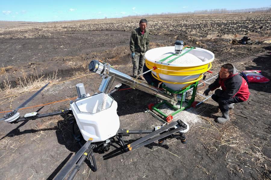 Farmers put paddy fertilizer into an agricultural drone in a field of Youyi Farm Co., Ltd. under Beidahuang Group in Shuangyashan, northeast China's Heilongjiang Province, April 9, 2026. (Xinhua/Wang Song)■